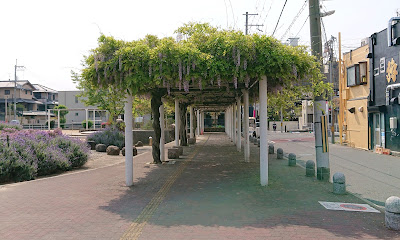 「藤まつり」で知られるフジの名所葛井寺の近くでもあるブクンダ公園には北側の道路沿いに長い藤棚が設けられています。